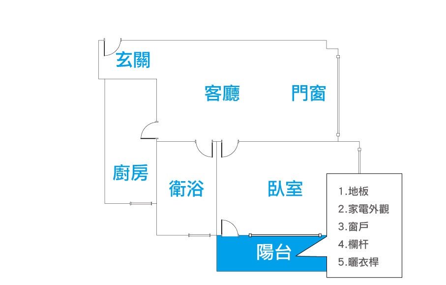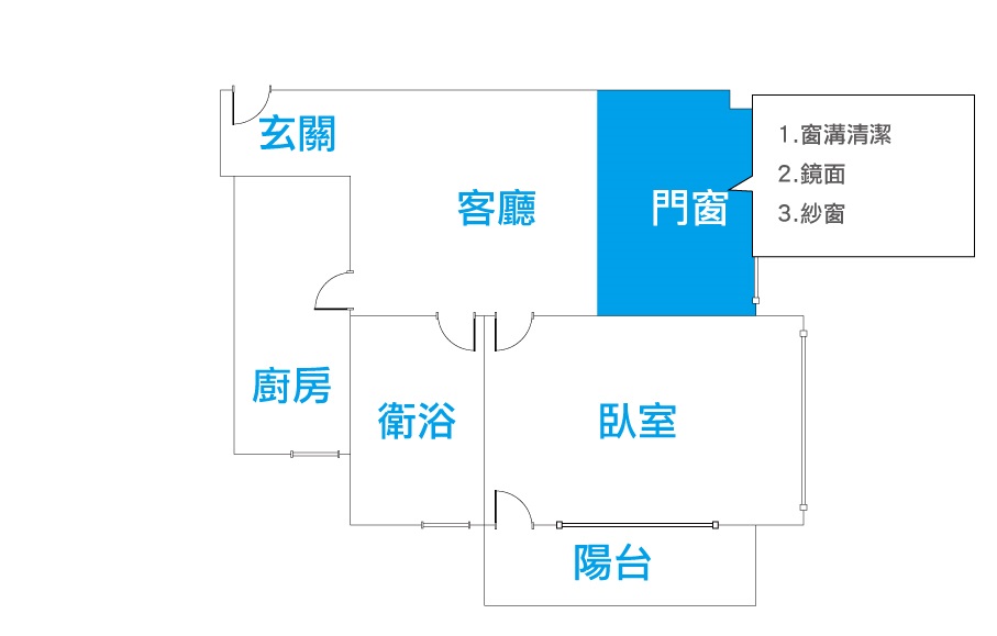 窗戶清潔:窗溝、窗框、紗門、玻璃細清。