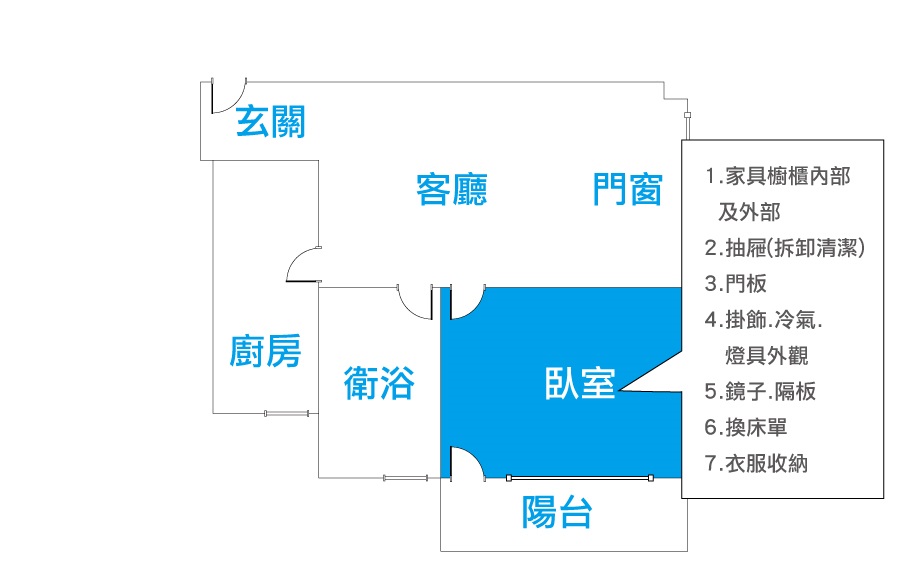 室內粉塵:牆壁、地面、天花板、吊燈、燈溝、窗溝、衣櫃內外部。