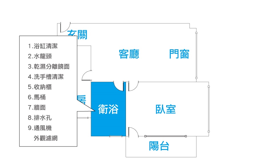 衛浴清潔:整間浴室、浴缸、馬桶、牆面磁磚、洗手台、地板、天花板等其他衛浴設備。